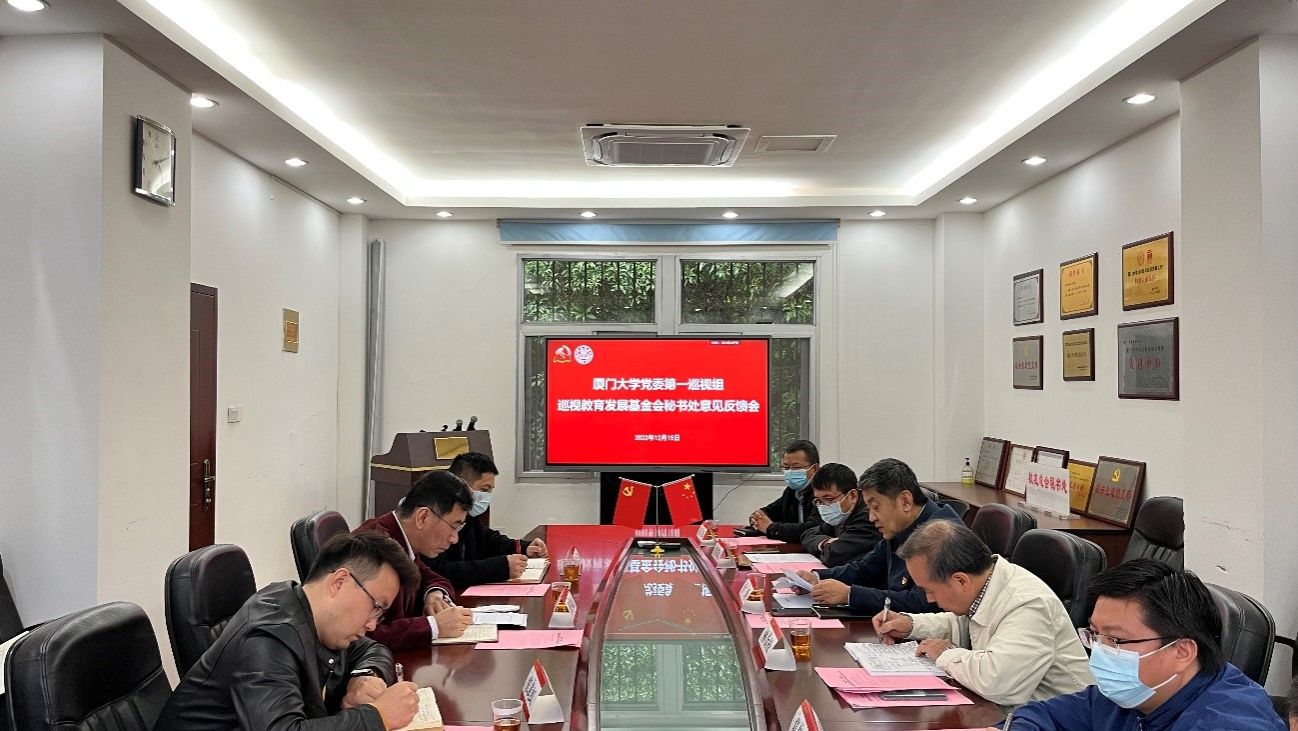 12月15日下午,校党委第一巡视组巡视教育发展基金会秘书处意见反馈会在大南路七号楼206会议室召开。校党委副书记、纪委书记、国家监委驻厦门大学监察专员全海,第一巡视组组长林金枝、副组长蔡郑伟,纪检监察机构代表第一纪检监察室主任房太伟,组织部门代表校党委组织员兼党建办副主任葛郝锐,巡视办副主任洪真裁出席会议。会议由教育发展基金会秘书处秘书长曾国斌主持。教育发展基金会秘书处领导班子及全体教职工参加会议。