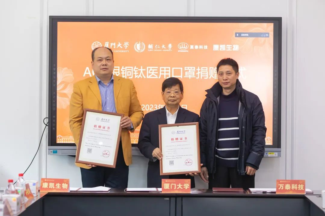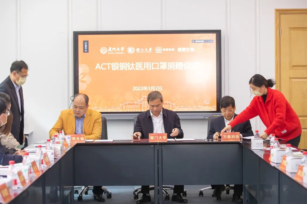 在辅仁大学副校长谢邦昌的联络和推动下,台湾万泰科技股份有限公司和湖南康凯生物科技有限公司联合向厦门大学捐赠ACT银铜钛医用口罩50万片。3月2日上午,ACT银铜钛医用口罩捐赠仪式在保欣丽英楼100会议室举行,万泰科技股份有限公司董事长张铭烈一行,湖南康凯生物科技有限公司总经理高时发一行,厦门大学资产与后勤事务管理处处长苏清伟、管理学院党委书记邱七星、教育发展基金会秘书处副秘书长徐滨、健康医疗大数据国家研究院副院长李奇渊、管理学院数据挖掘中心主任朱建平以及师生代表参加仪式,辅仁大学资源与事业发展副校长谢邦昌在线上参加仪式。