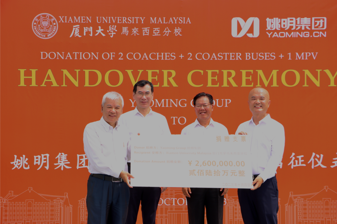 10月4日,在中马两国领导人共同见证厦门大学马来西亚分校共建协议签署十周年之际,姚明集团捐赠厦门大学马来西亚分校车辆交付启动出征仪式在分校百姓大楼南广场举行。厦门大学1985级企管系校友、厦门校友会会长、厦门姚明集团董事长姚明,厦门大学原校长、校友总会荣誉理事朱崇实,马来西亚分校校长王瑞芳等出席捐赠仪式,教育发展基金会秘书处、分校相关部门负责人以及来自十余个国家的师生代表参加了本次活动。
