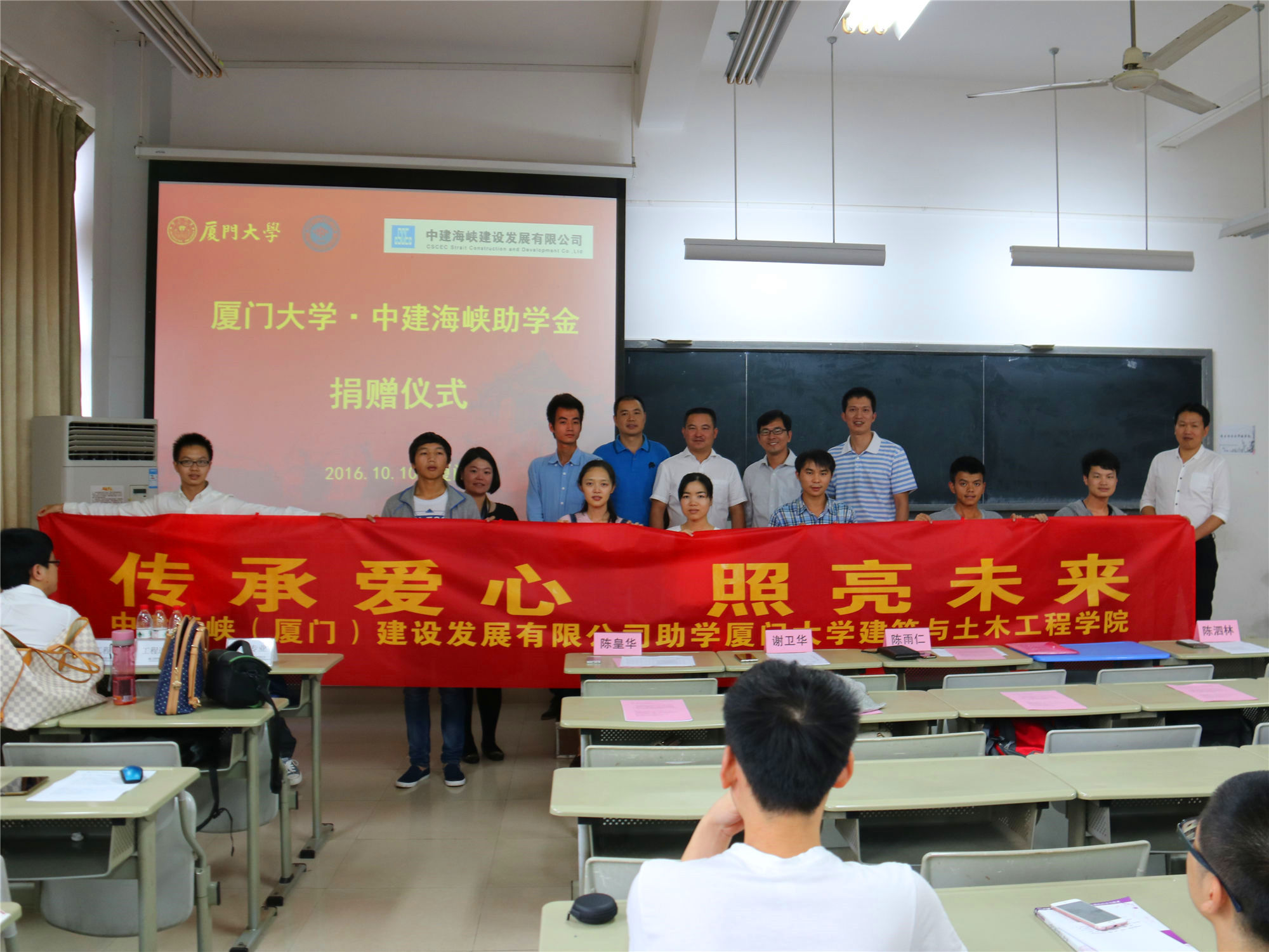 10月10日,中建海峡建设发展有限公司向我校建筑与土木工程学院捐赠三万元人民币,设立厦门大学“中建海峡助学金”,捐赠仪式在海韵教学楼202举行。