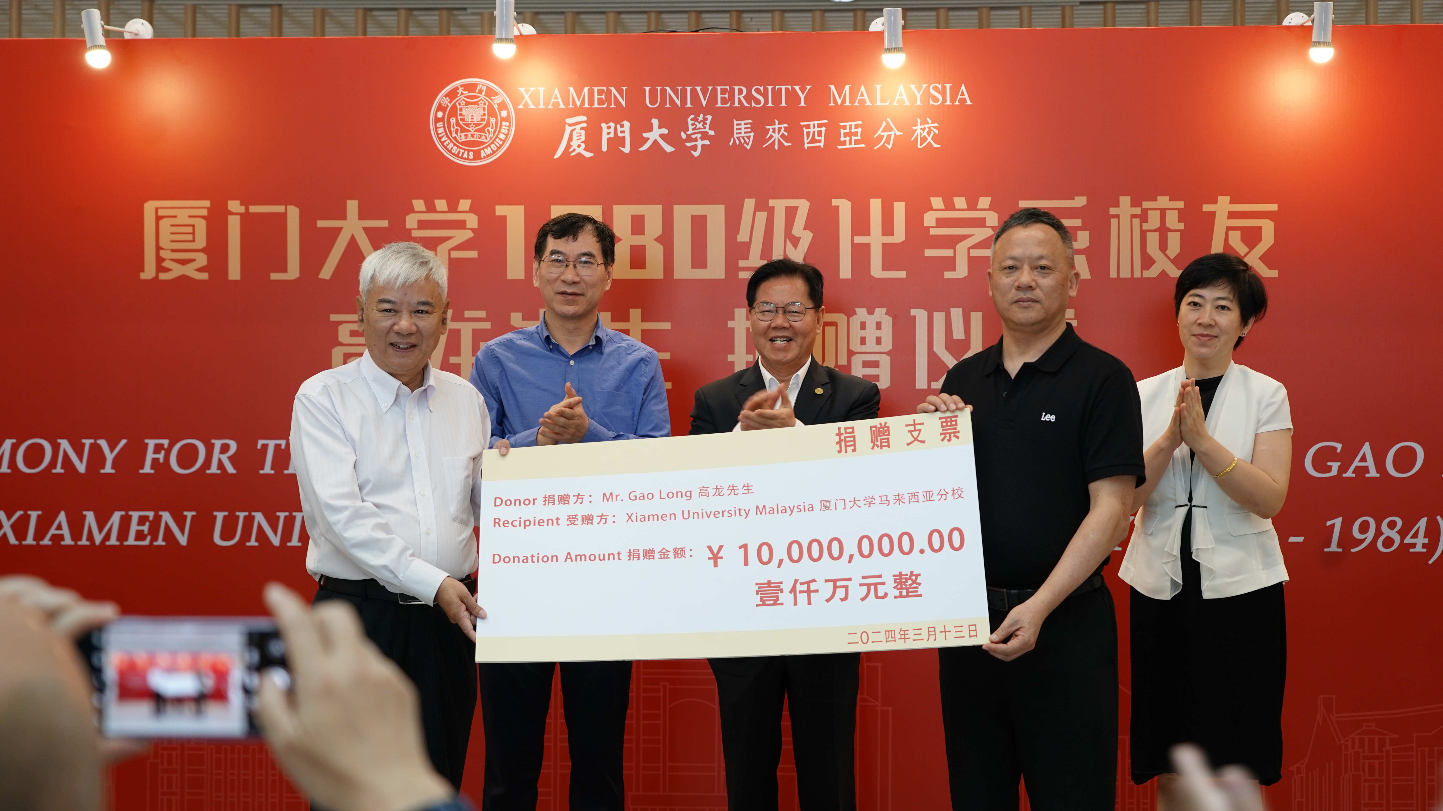 3月13日,高龙校友捐赠厦门大学马来西亚分校仪式在分校百姓大楼举行。厦门大学1980级化学系校友、云南校友会会长、云南祥华教育集团董事长高龙,厦门大学原校长朱崇实教授、马来西亚分校校长王瑞芳教授等出席捐赠仪式,福建省闽商研究会企业家代表、厦门大学教育发展基金会秘书处、马来西亚分校相关部门负责人、各地校友会代表以及来自十余个国家的师生代表参加了本次活动。
