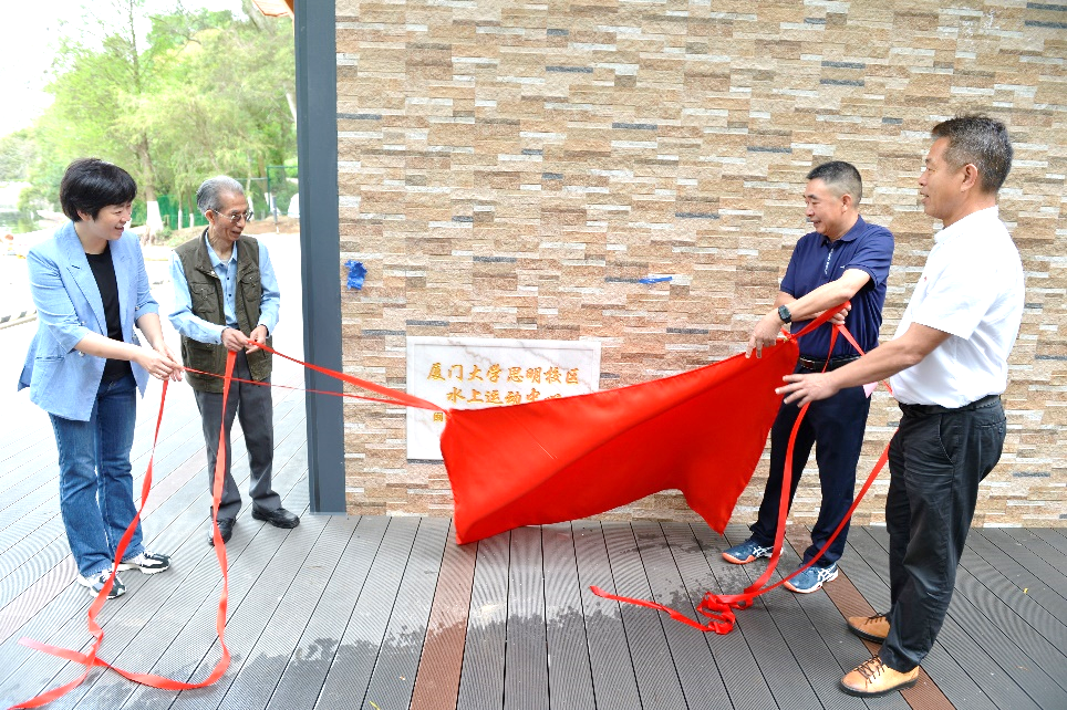 张莹、赵晓慧、郑树东和林致诚为“厦门大学思明校区水上运动中心”揭牌,在场领导、来宾和师生共同见证并合影留念。
