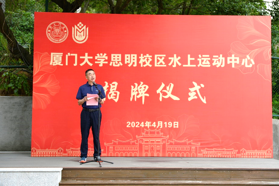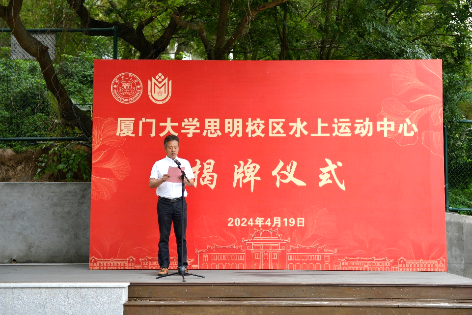 2024年4月19日上午,由闽都陈嘉庚公益基金会捐助支持的厦门大学思明校区水上运动中心顺利揭牌,闽都陈嘉庚公益基金会副秘书长张莹、厦门大学教育发展基金会秘书处秘书长赵晓慧、体育教学部党委书记郑树东和水上运动项目的师生代表等出席。揭牌仪式由体育教学部主任林致诚主持。