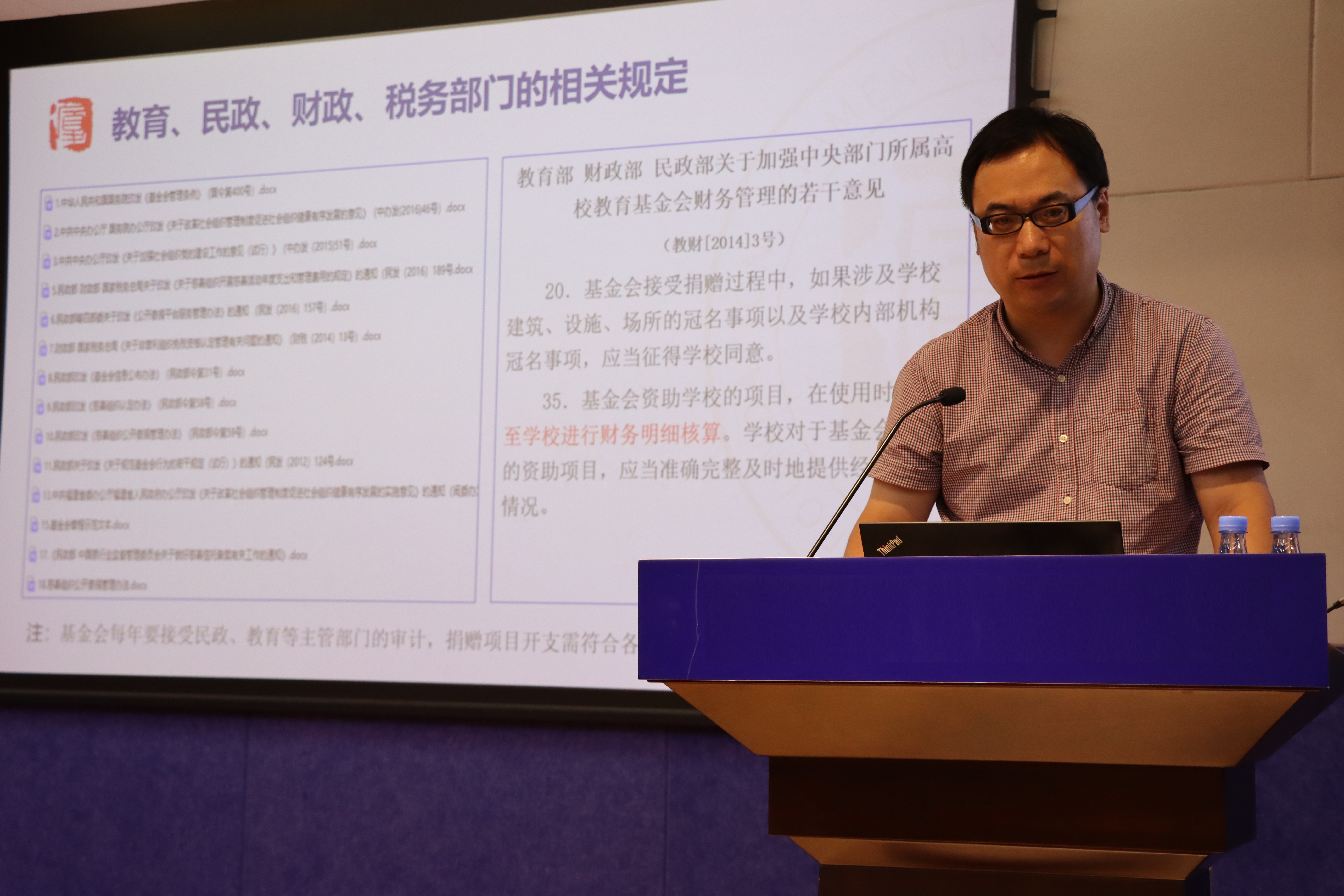 教育发展基金会秘书处财务与投资管理部主任王学军针对捐赠项目财务支出管理,详细分享了国家相关法律法规、上级主管部门有关规定和学校、基金会具体管理办法,并重点介绍了捐赠项目在财务管理上的具体细则和注意事项。项目管理部主任许丽莹聚焦捐赠项目管理流程进行深入讲解,分享了学校捐赠工作流程的实操经验,就可能存在的风险点进行合规提示,并结合具体案例解读个人及企业公益性捐赠税前扣除政策,提供了明晰的捐赠工作指引。
