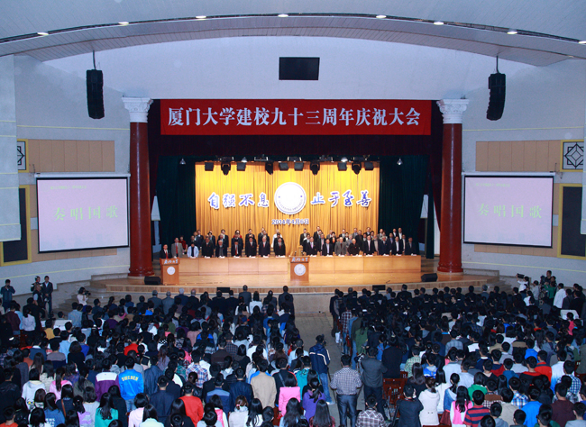 4月6日上午,学校在建南大会堂举行大会,隆重庆祝建校93周年。校领导、院士、海内外校友、嘉宾、师生代表共两千多人参加大会。大会上,学校接受了一批社会捐赠,表彰了翔安校区建设先进单位和个人,颁发了2014年校庆南强杰出贡献奖等各项奖教金、嘉庚奖章及各项奖学金。