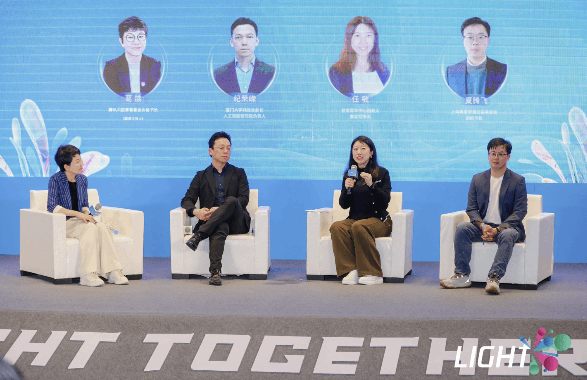 发布会现场,腾讯公益慈善基金会秘书长葛燄与厦门大学科技处处长、人工智能研究院负责人纪荣嵘、上海真爱梦想公益基金会副秘书长夏腾飞、益优青年服务中心创始人兼副理事长任敏围绕「“青年力量+AI”为公益助燃」主题,深入探讨了在AI技术浪潮下,技术如何为公益注入新能量,也为当下的青年们呈现出一个真实的AI+公益的图景面貌,倡导青年们用AI技术产生的创造力为社会勾勒美好画卷。