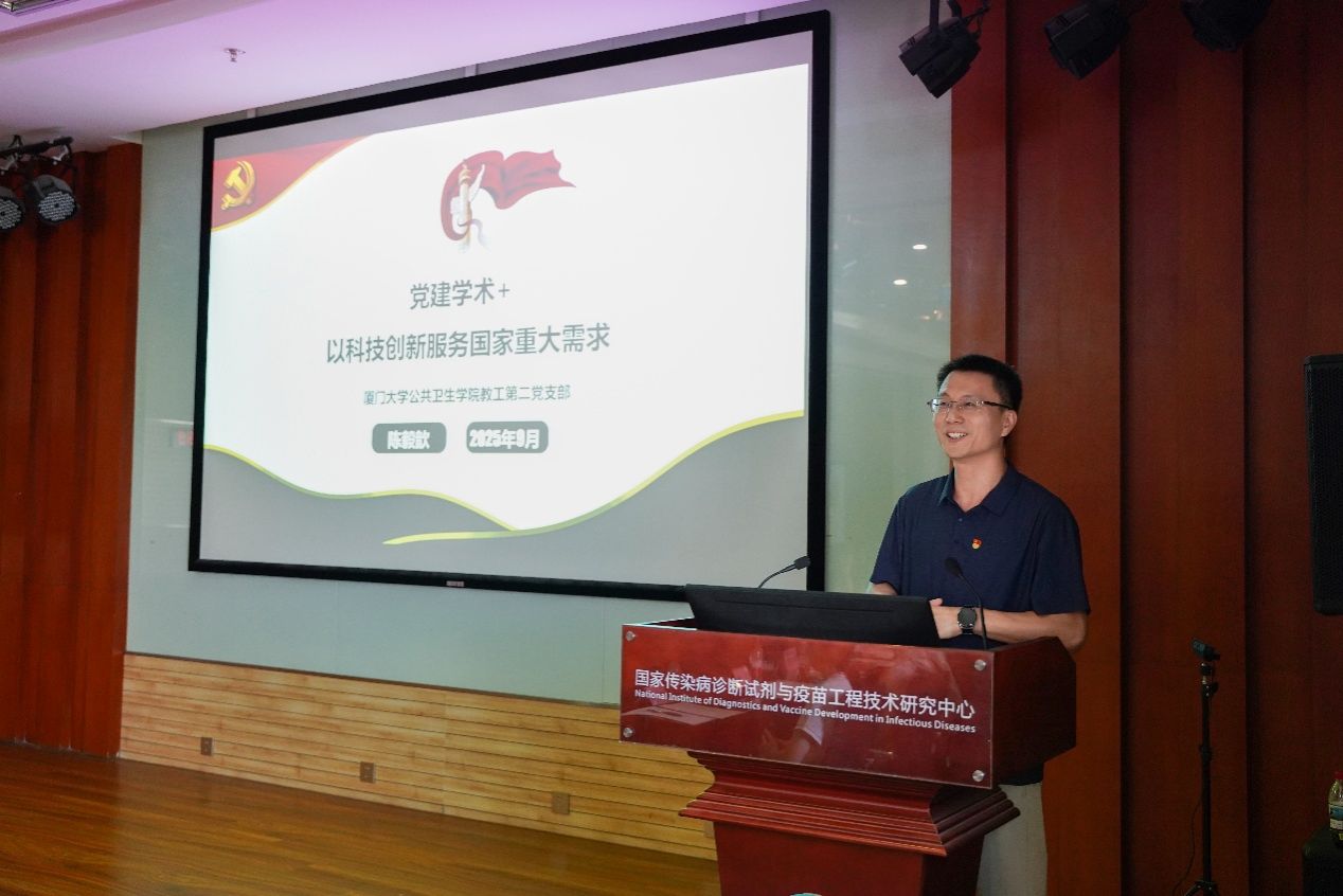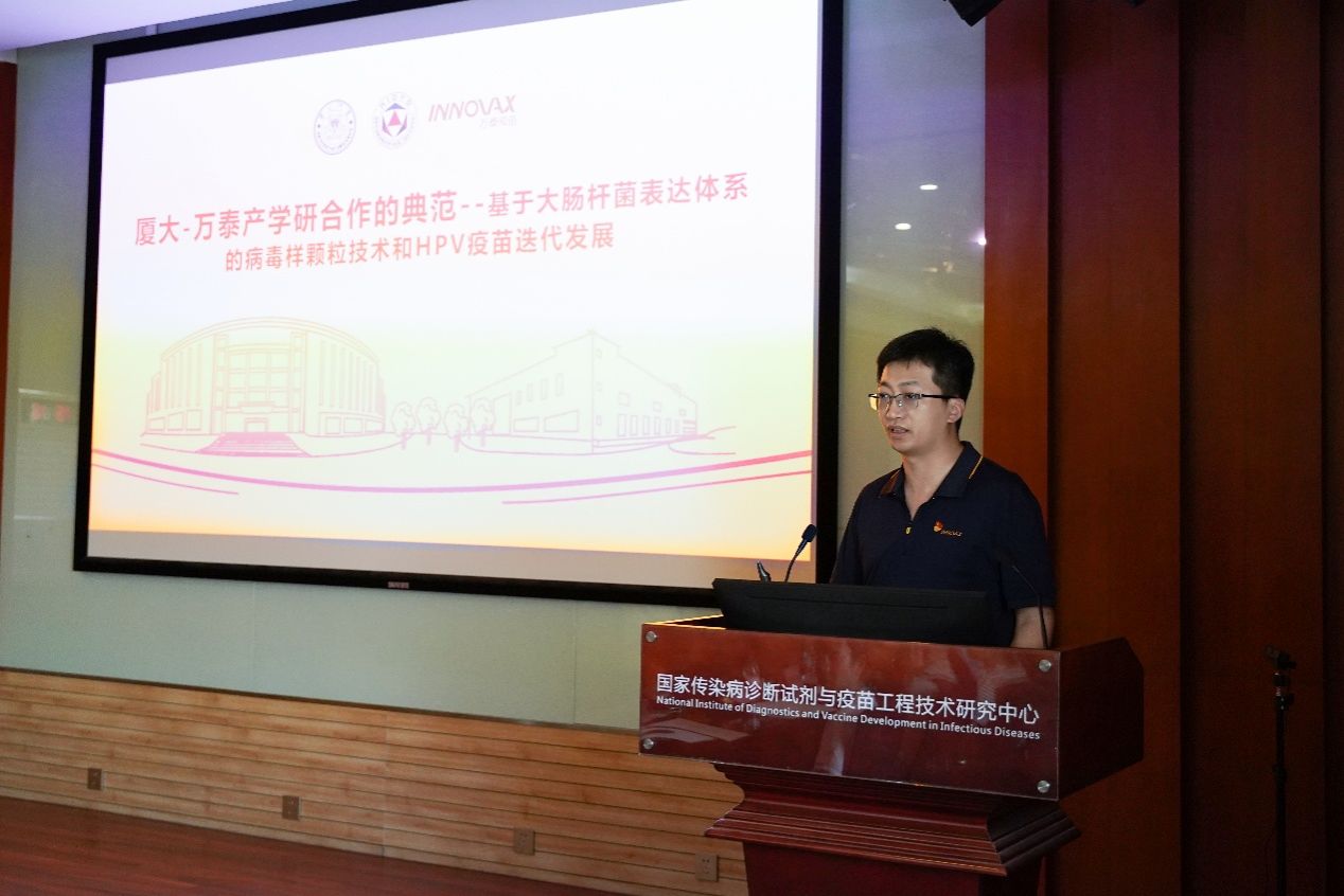公共卫生学院P3实验室副主任、教工第二党支部副书记陈毅歆教授介绍了支部以党建引领科技创新、人才培育和产业转化的典型经验;厦门万泰沧海生物技术有限公司研发总监王大宁回顾了公司与厦大携手20年、依托全球首创的大肠杆菌表达病毒样颗粒(VLP)平台,相继推出国产首支HPV二价疫苗“馨可宁®”和今年5月刚刚获批上市的国产首个九价HPV疫苗“馨可宁®9”的产学研协同历程;教育发展基金会秘书长赵晓慧介绍了厦门大学教育发展基金会的基本概况,并分享了基金会在公益赋能科研前沿与产业转化的做法,指出要“让最前沿的研究在最需要雪中送炭的时候得到社会力量的加持”。她期待基金会能够在未来的工作中为高校和企业之间产学研的深度融合提供更好的服务,搭建更好的沟通桥梁。