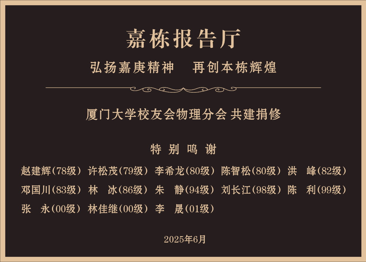 近日,物理科学与技术学院大楼117报告厅历经数月精心改造,正式以“嘉栋报告厅”之名全新亮相并投入使用。这座承载着学院十余年学术记忆的空间,在13位校友的大力支持下完成华丽蜕变,既延续了“弘扬嘉庚精神,再创本栋辉煌”的文化传承,更成为连接校友情怀与学院发展的重要纽带。