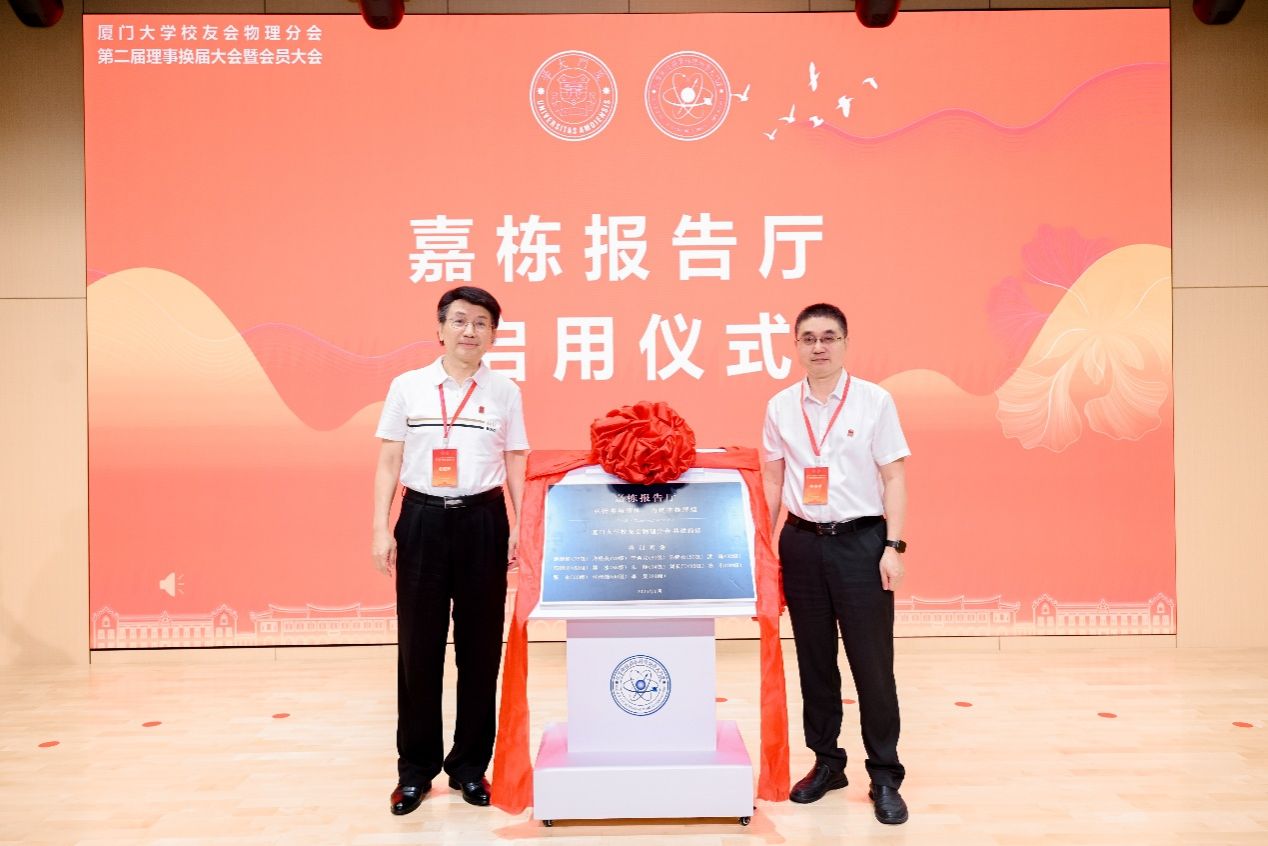 物理分会理事长赵建辉和学院党委书记李书平共同为嘉栋报告厅揭牌