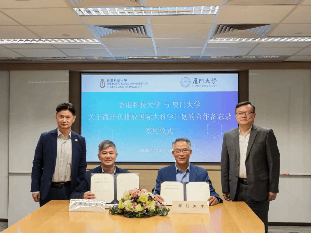 代表团访问香港科技大学,与香港科技大学副校长吴宏伟及理学院海洋领域、工学院计算机领域、新兴跨学科领域的学者座谈交流。厦门大学海洋与地球学院教授、中国科学院院士焦念志,香港科技大学理学院海洋科学系讲座教授刘红斌共同签署《关于海洋负排放国际大科学计划的合作备忘录》。未来,两校将继续深化在海洋领域的合作,推动科研资源共享与优势互补,提升原创成果和人才培养水平,服务国家“双碳”目标和教育强国战略。