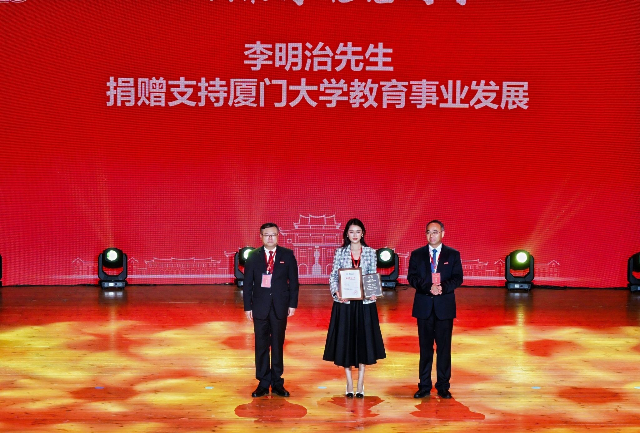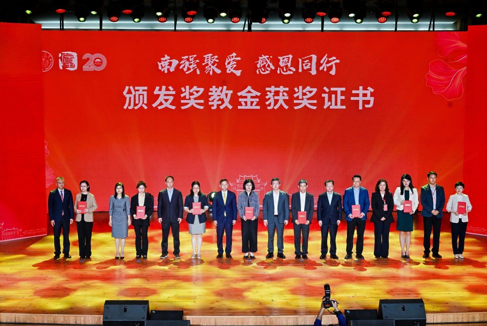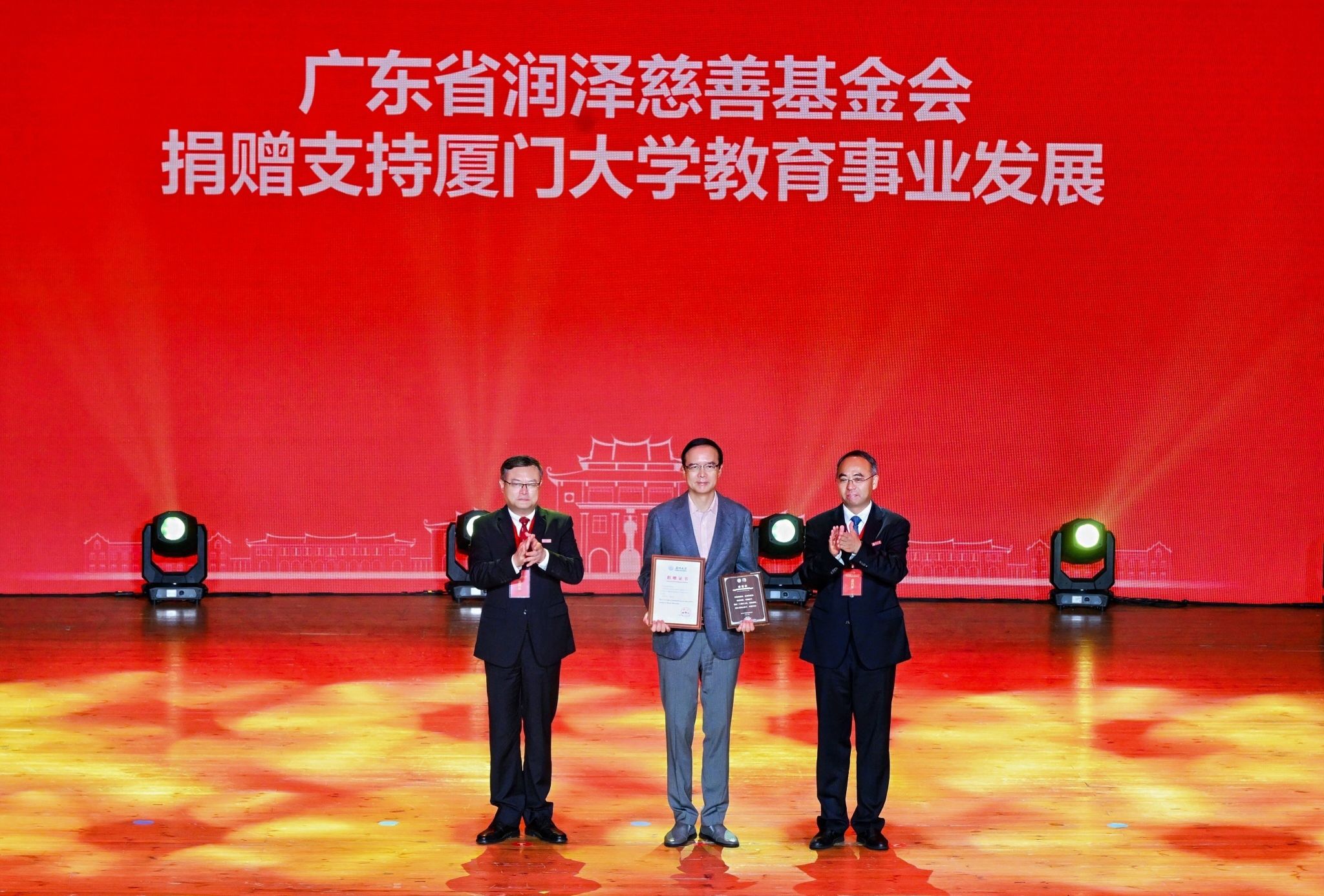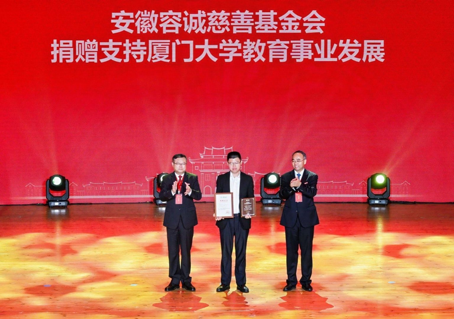 南强聚爱践初心,感恩同行育新人。4月6日,在厦门大学迎来建校105周年、教育发展基金会成立20周年之际,以“南强聚爱·感恩同行”为主题的感恩答谢活动在思明校区科学艺术中心二楼音乐厅举行。活动以弘扬嘉庚精神为主线,聚焦捐赠育人主题,将社会捐赠与立德树人深度融合,展现社会各界爱心力量与学校同心筑梦、协同育人的生动实践,进一步凝聚海内外校友、社会贤达与学校同向同行、共筑一流的强大合力。教育发展基金会理事长、校党委书记、中国科学院院士张荣,校长、中国科学院院士胡文平出席,校党委副书记孙理宣读颁奖决定,校党委常委、副校长李智勇主持捐赠仪式,海内外校友代表、社会各界嘉宾、基金会历届理监事代表及学校师生代表出席活动。