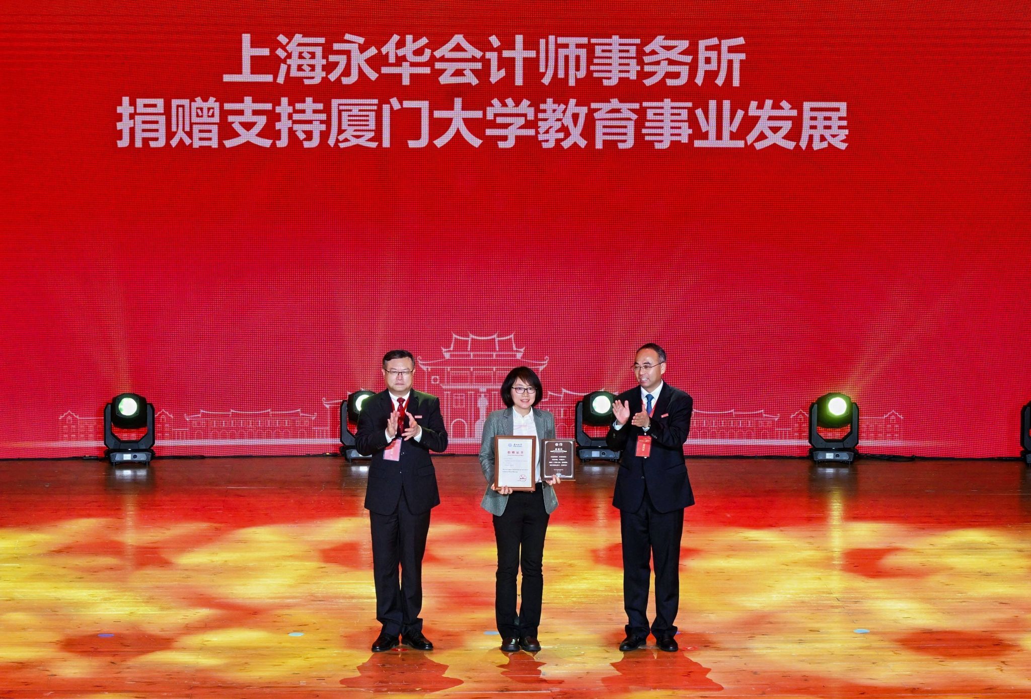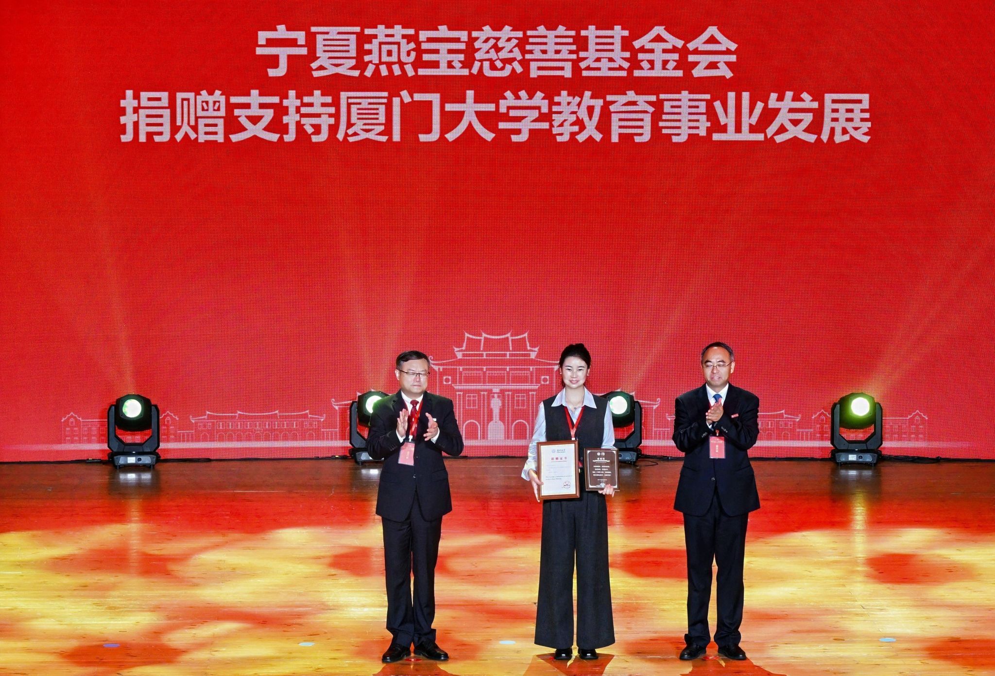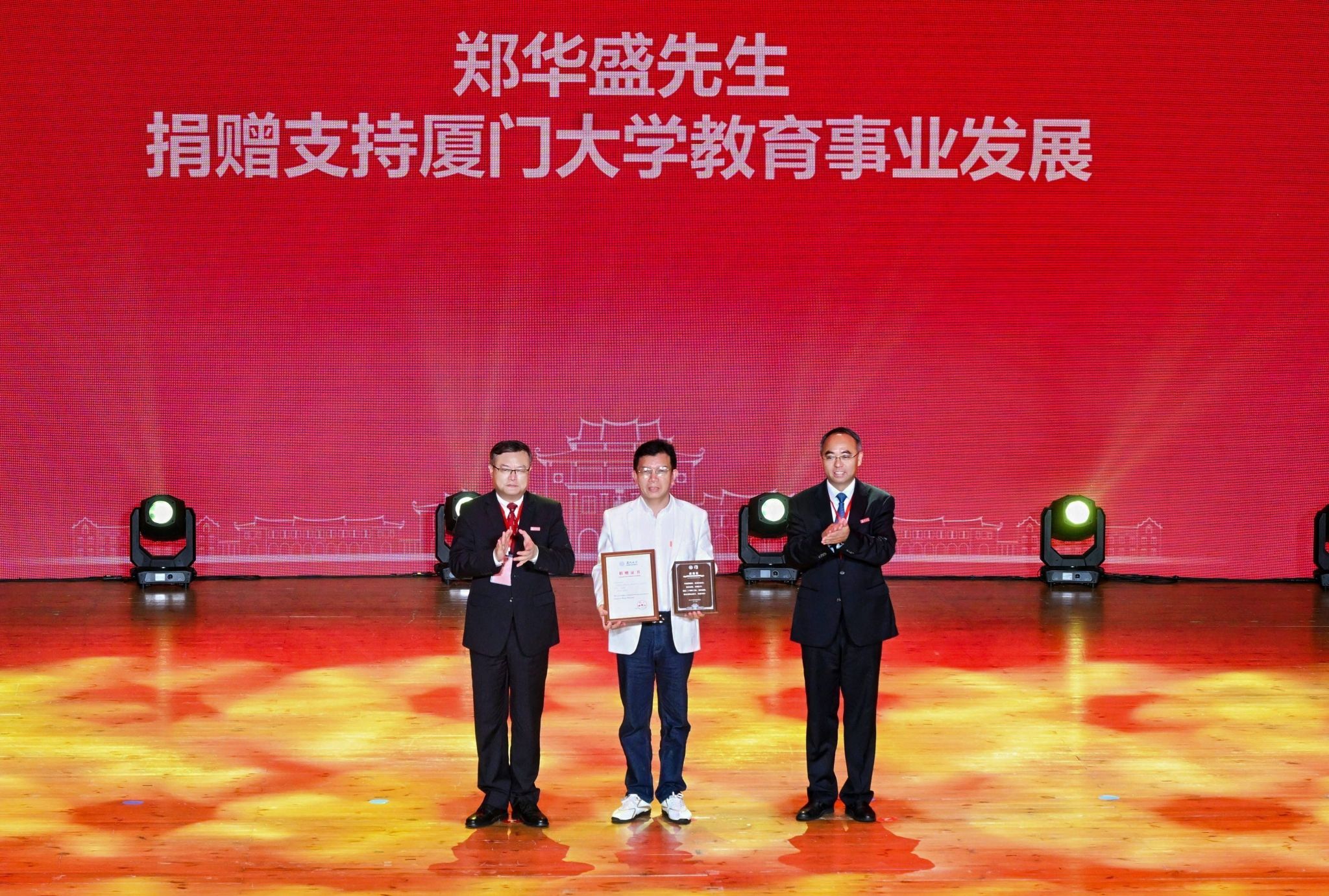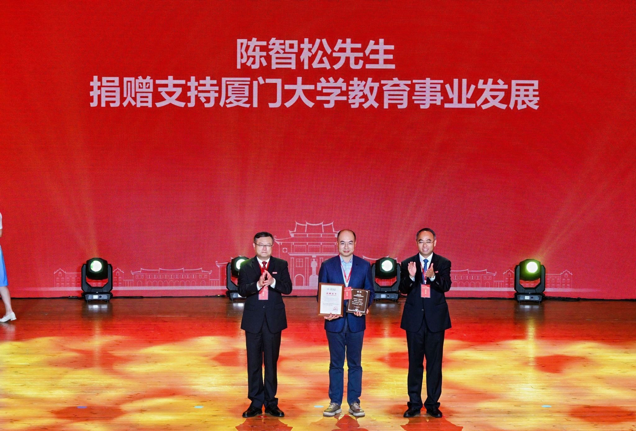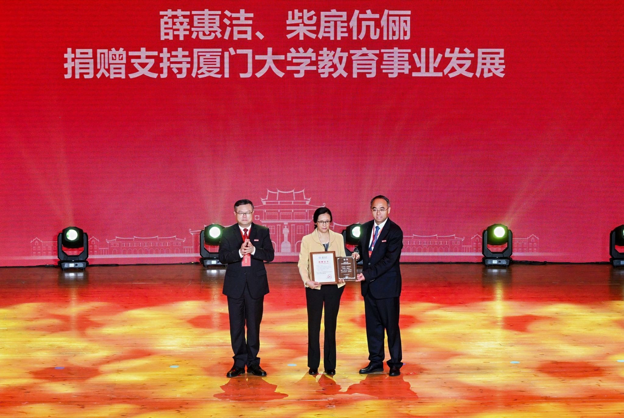南强聚爱践初心,感恩同行育新人。4月6日,在厦门大学迎来建校105周年、教育发展基金会成立20周年之际,以“南强聚爱·感恩同行”为主题的感恩答谢活动在思明校区科学艺术中心二楼音乐厅举行。活动以弘扬嘉庚精神为主线,聚焦捐赠育人主题,将社会捐赠与立德树人深度融合,展现社会各界爱心力量与学校同心筑梦、协同育人的生动实践,进一步凝聚海内外校友、社会贤达与学校同向同行、共筑一流的强大合力。教育发展基金会理事长、校党委书记、中国科学院院士张荣,校长、中国科学院院士胡文平出席,校党委副书记孙理宣读颁奖决定,校党委常委、副校长李智勇主持捐赠仪式,海内外校友代表、社会各界嘉宾、基金会历届理监事代表及学校师生代表出席活动。
