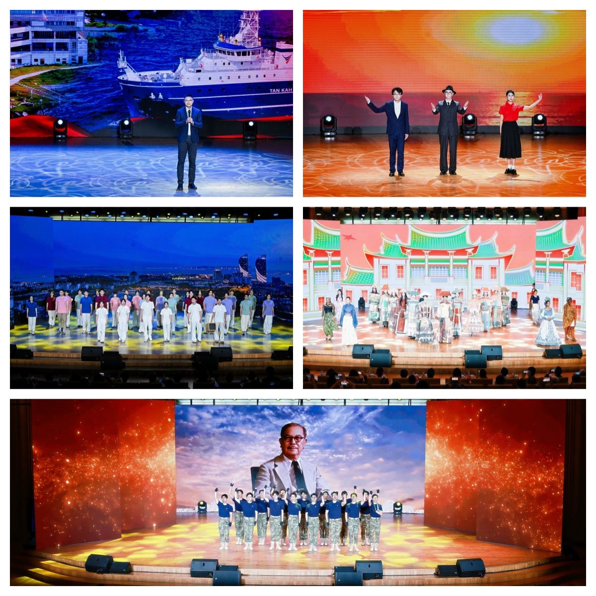 活动在基金会20周年主题视频中温情启幕,一系列师生原创文艺展演将捐赠故事转化为鲜活的思政课堂,让嘉庚精神可感可学、直抵人心。《家国情怀·薪火铸魂》篇章深情展现各界力量托举高校科研、助力强国育人的使命担当。诗剧《527次的回答》以跨时空对话形式,再现校友个人527次捐赠的真实事迹,让“受助—自助—助人”的育人闭环在舞台上生动呈现。在《凤凰花开·逐梦南强》篇章中,10位以奖学奖教金获得者为原型的学生演员依次分享成长历程,讲述他们从大山深处走向梦想舞台、从受助者变为助人者的蝶变,充分印证捐赠不仅是物质帮扶,更是精神托举。《文化传薪·情连海外》由厦门大学多国学生共同呈现时装表演,展演服饰巧妙融合嘉庚建筑美学与各国传统服饰特色,生动展现学校开放办学与中华文化海外传播的丰硕成果。